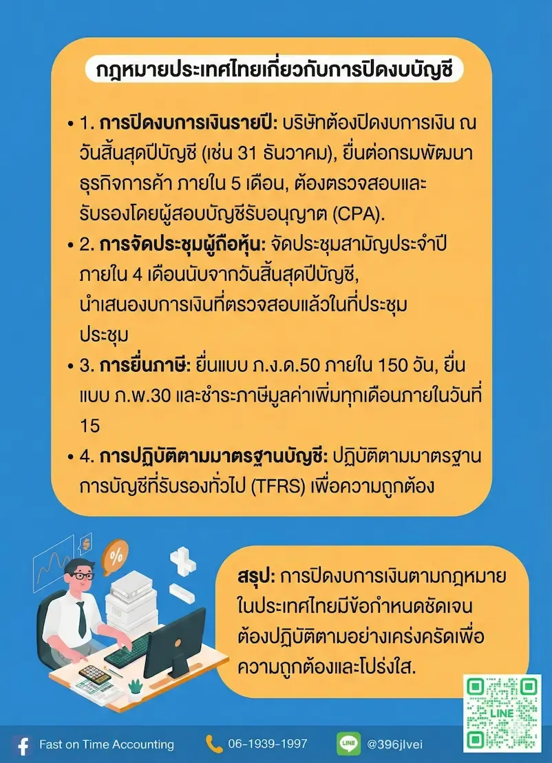 การปิดงบการเงินไม่ใช่เพียงแค่การจัดเตรียมข้อมูลทางการเงินเพื่อนำส่งให้กรมสรรพากรและกรมพัฒนาธุรกิจการค้าเท่านั้น แต่ยังเป็นกระบวนการทางบัญชีที่สำคัญ ซึ่งต้องดำเนินการอย่างน้อยปีละครั้ง กระบวนการนี้ประกอบด้วยขั้นตอนที่ซับซ้อนและต้องมีการตรวจสอบโดยผู้จัดทำบัญชีและผู้ตรวจสอบบัญชี หากธุรกิจหรือองค์กรใดไม่ดำเนินการปิดงบการเงินประจำปี จะถือว่ามีความผิดและต้องรับโทษตามกฎหมาย ซึ่งอาจรวมถึงการปรับเงิน